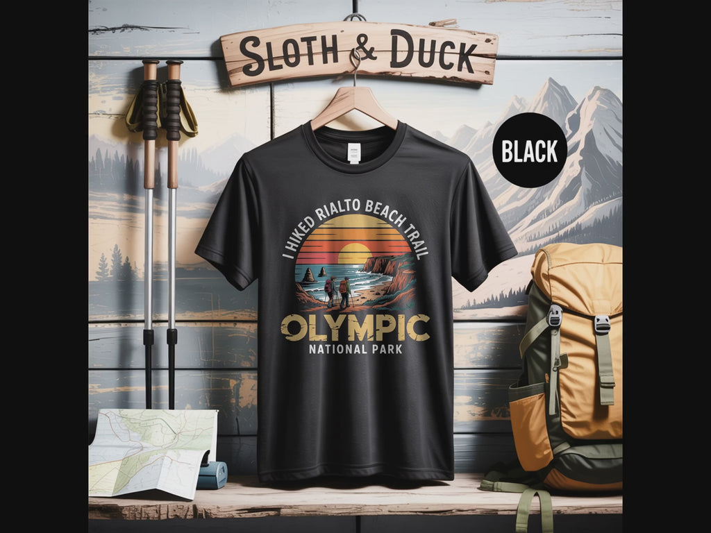 Show off your love for the Pacific Northwest with this Olympic National Park T-shirt. Featuring a design of hikers along Rialto Beach with a colorful sunset, this tee is perfect for anyone who loves hiking, camping, or exploring the outdoors. A unique design showing hikers on Rialto Beach.