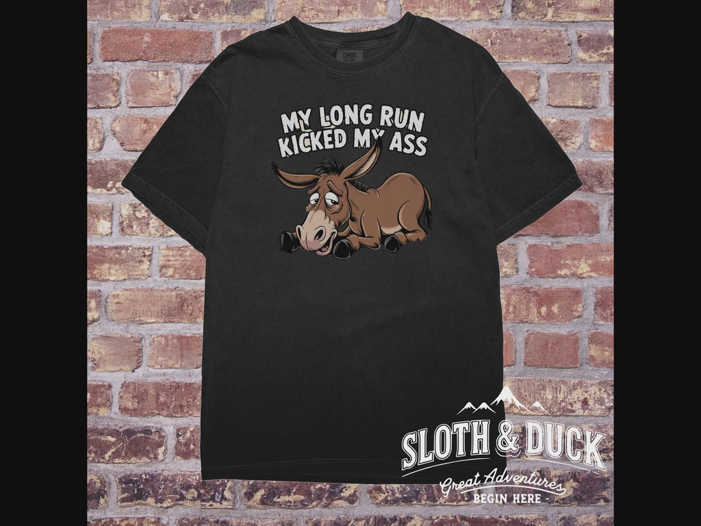 Funny graphic T-shirt with a humorous exhausted donkey design perfect for expressing your post-run feelings while keeping your style casual and unique.
