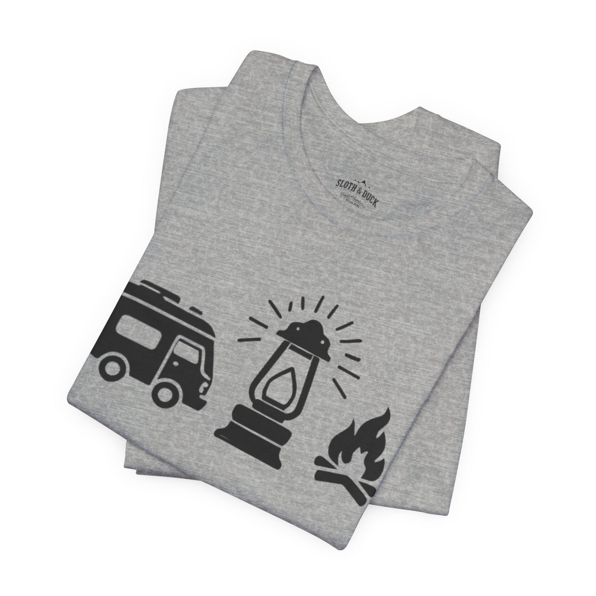 A casual and comfortable unisex T-Shirt featuring graphic icons of an RV, lantern, and campfire, perfect for outdoor enthusiasts and camping lovers. The design gives a rustic and adventurous vibe, ideal for wearing during camping trips, hiking expeditions, or outdoor gatherings.