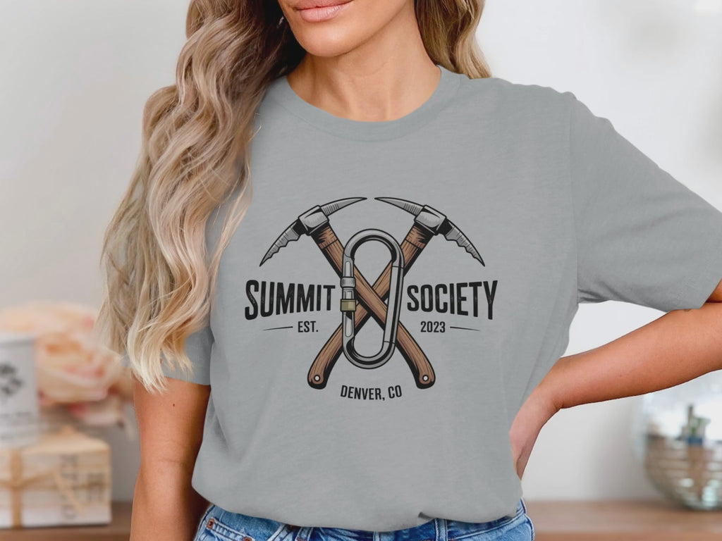 Show your love for the mountains with this awesome "Summit Society" T-shirt. The design features crossed ice axes and a carabiner, perfect for climbers, mountaineers, and outdoor enthusiasts.
