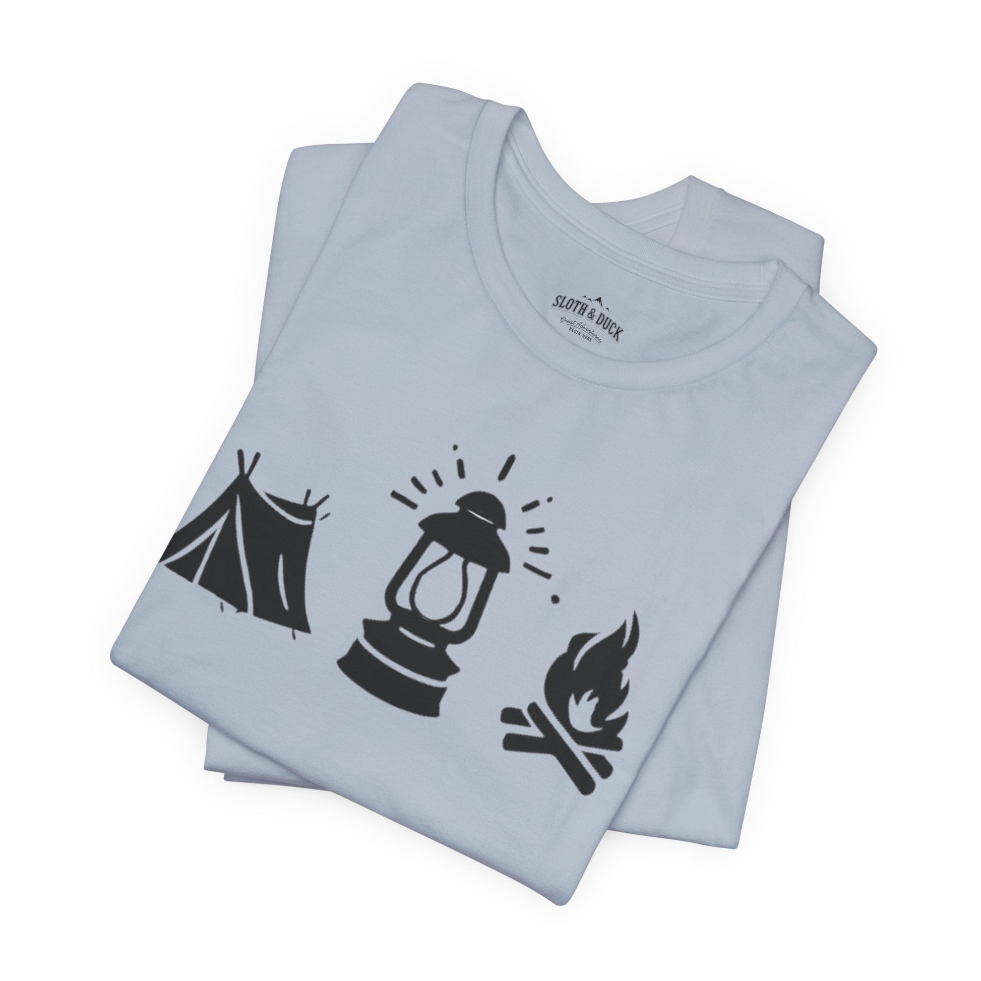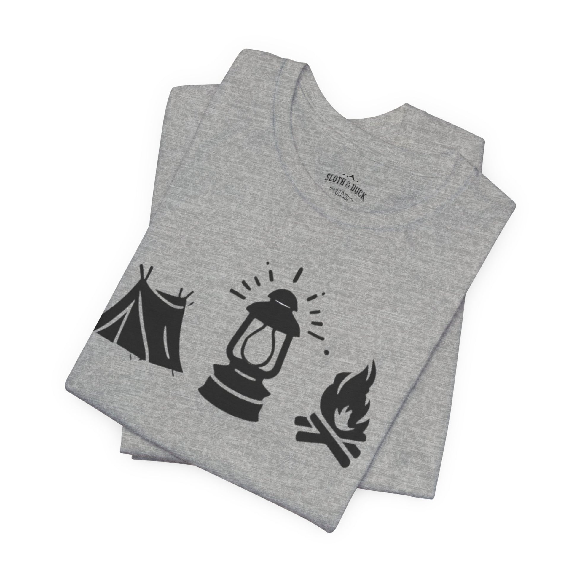 A casual and comfortable unisex T-Shirt featuring graphic icons of a tent, lantern, and campfire, perfect for outdoor enthusiasts and camping lovers. The design gives a rustic and adventurous vibe, ideal for wearing during camping trips, hiking expeditions, or outdoor gatherings.